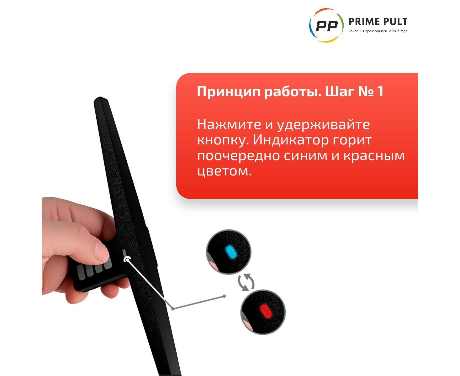 • При удержании кнопки индикатор устройства переменно мигает синим и красным