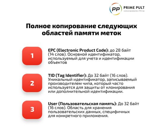 Устройство обеспечивает полное копирование следующих областей памяти меток: • EPC (Electronic Product Code): До 28 байт (14 слов). Основной идентификатор, используемый для учета и идентификации объектов.