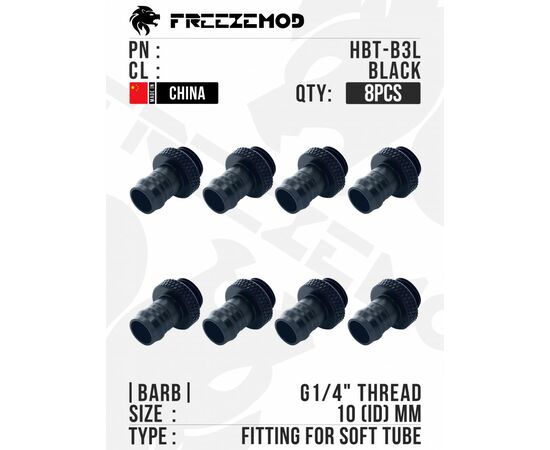 FREEZEMOD Barb Fitting for 10mm ID Soft Tube, HBT-B3L, Black - 8шт.
