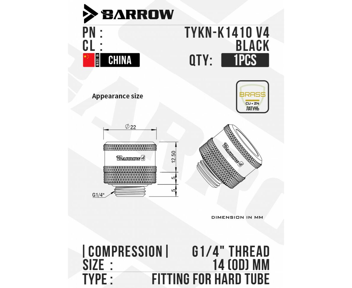 Компрессионный фитинг для жестких трубок внешним диаметром 14 мм от Barrow. Изготовлен из латуни. Обладает стандартным дизайном для всей серии TYKN.
