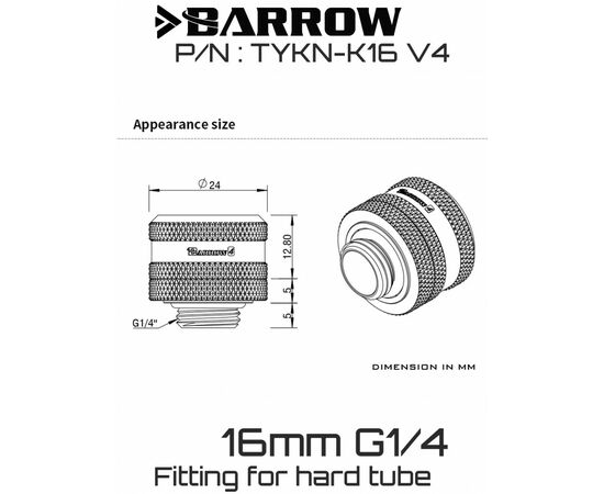 Фитинг серии "TYKN" от BARROW предназначен для жестких трубок диаметром 16 мм. В его основании установлены две прокладки, обеспечивающие герметичность соединения. Другие прокладки из набора надеваются на трубку и зажимаются с помощью компрессионной гайки. Это надежно фиксирует трубку в фитинге.