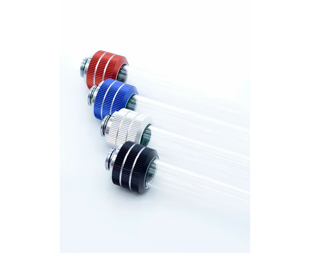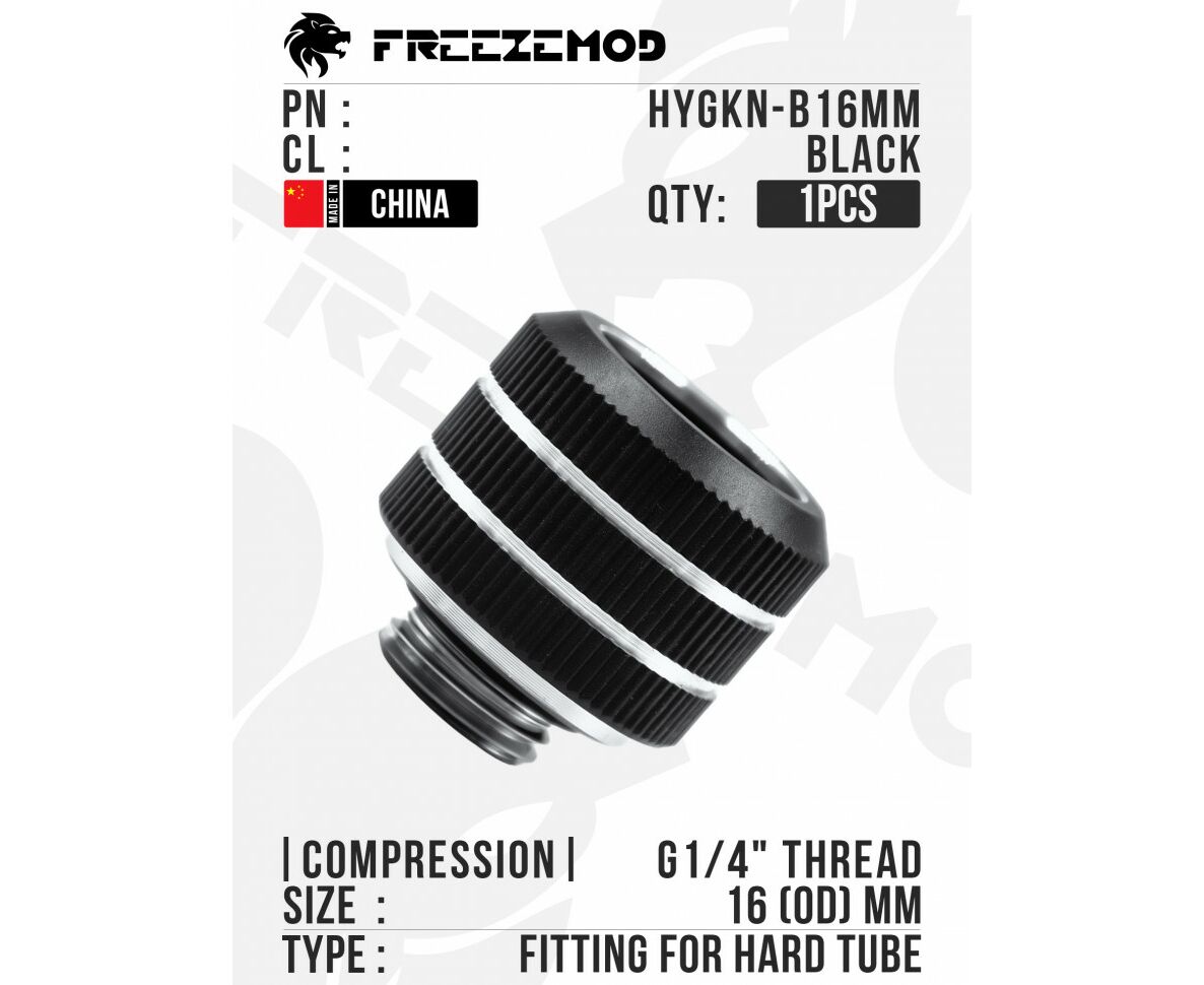 Один из наиболее доступных компрессионных фитингов от компании FREEZEMOD предназначен для твёрдых трубок диаметром 16 мм. В конструкции фитинга предусмотрена система Anti-slip, включающая специальное уплотнительное кольцо особой формы, что эффективно предотвращает выскальзывание трубки. Основание фитинга, контактирующее с водой, изготовлено из латуни, а компрессионная гайка, прижимающая уплотнитель, выполнена из алюминия, что позволило снизить стоимость изделия. Для установки основания рекомендуется использовать шестигранный ключ на 8 мм. Монтаж фитинга осуществляется по стандартной схеме: сначала надевается компрессионная гайка на трубку, затем устанавливается уплотнитель и соединяется с основной частью фитинга, после чего производится затяжка.