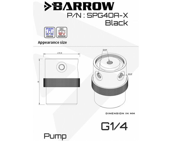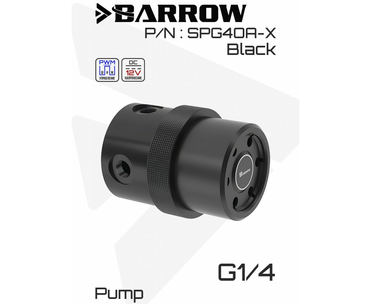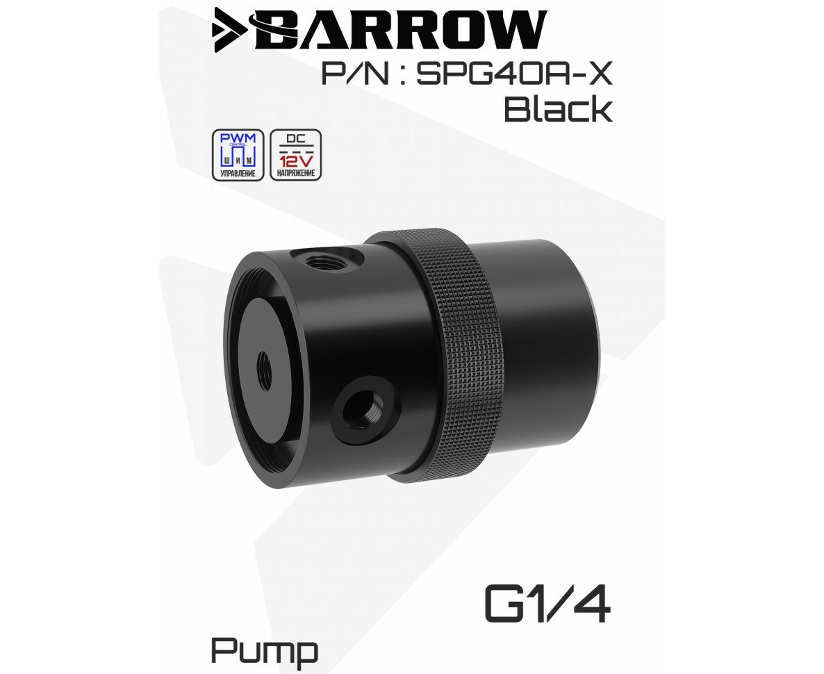 Помпа SPG40A-X формата D5 от BARROW в прочном алюминиевом корпусе с топом из износостойкого ПОМ-пластика сочетает высокую производительность, стильный дизайн и надежность; оснащена тремя портами G1/4" для гибкой компоновки системы водяного охлаждения, поддерживает управление по ШИМ (PWM) для точной регулировки скорости и совместима с установкой резервуара — идеальное решение для энтузиастов, собирающих мощные и эстетичные кастомные СЖО.