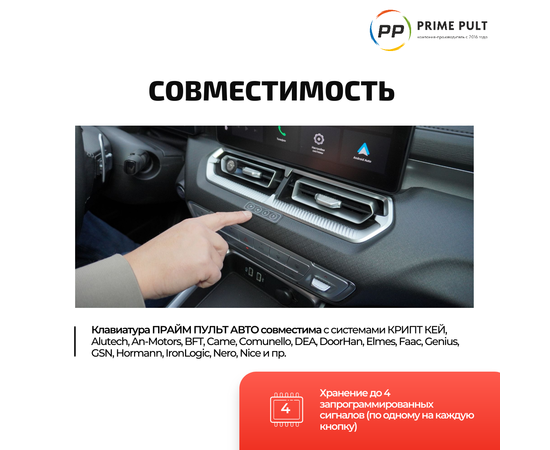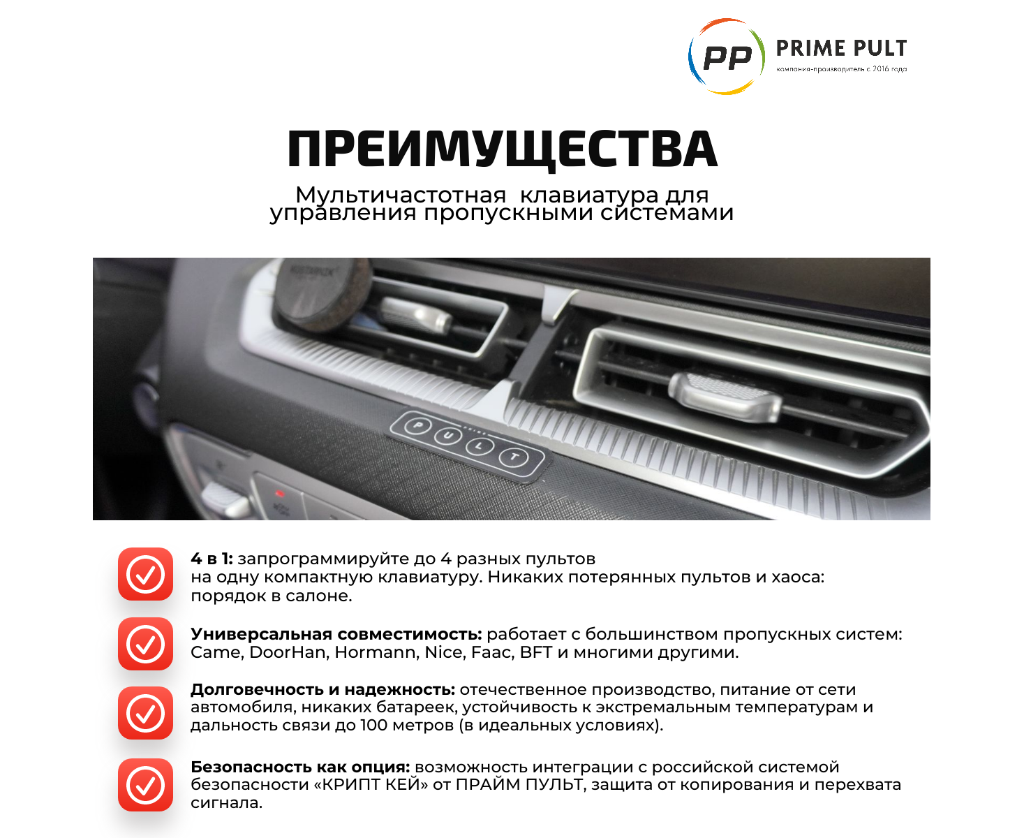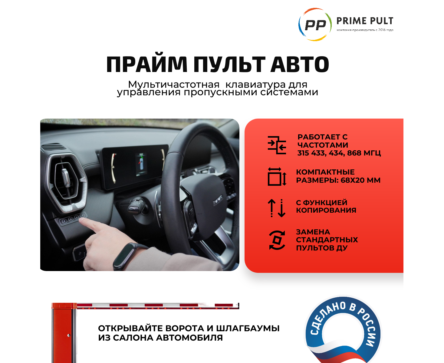 ПРАЙМ ПУЛЬТ АВТО - универсальная панель управления для автомобиля. Забудьте о ворохе брелоков. Управляйте шлагбаумами и воротами с одной кнопки в салоне!