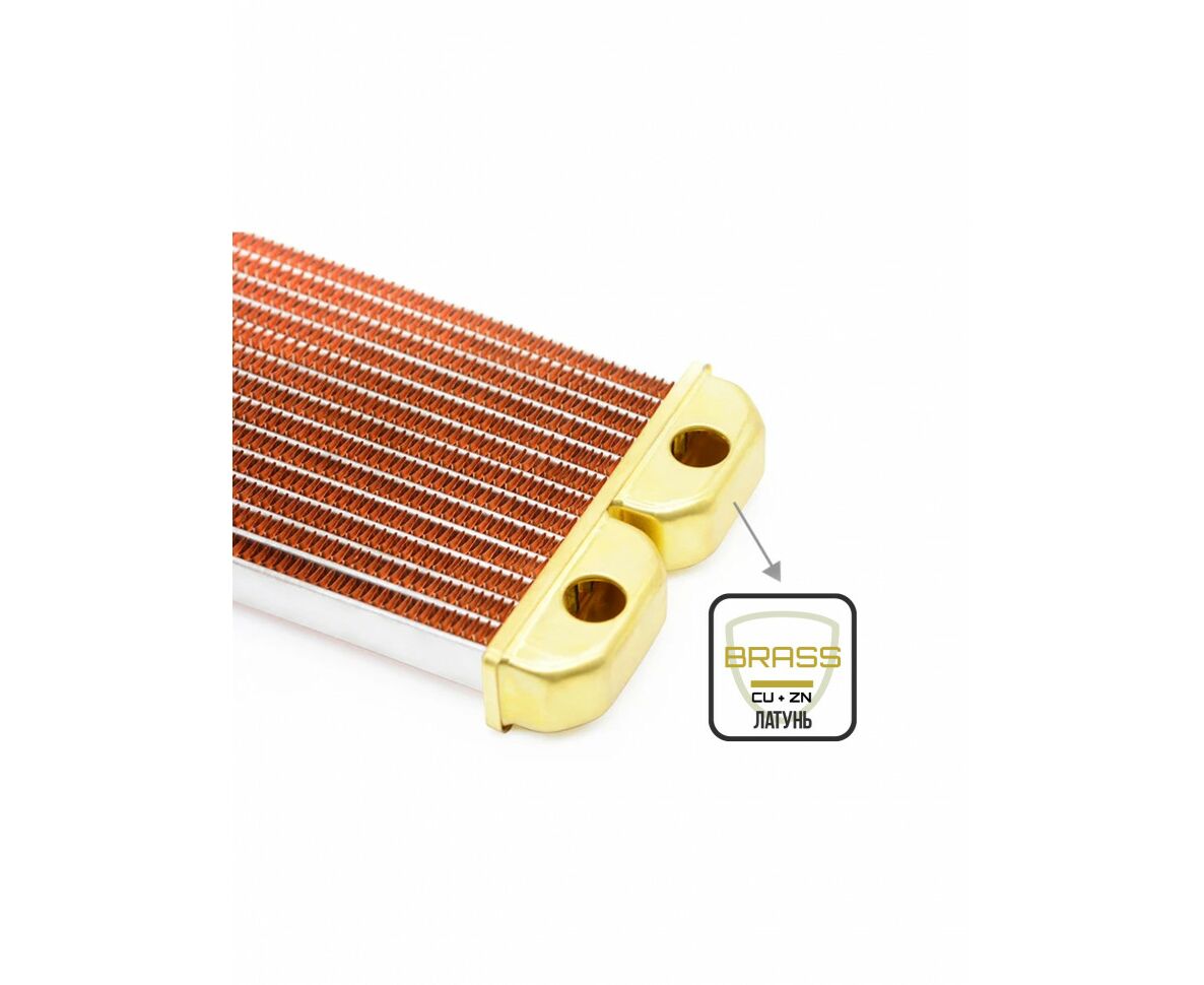 Материалы: Водяная камера - латунь, ребра - медь, защитная пластина - нержавеющая сталь SUS430