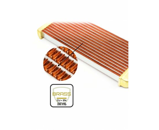 Радиатор имеет классическую конструкцию. Его оребрение выполнено из меди, а камеры и каналы — из латуни.