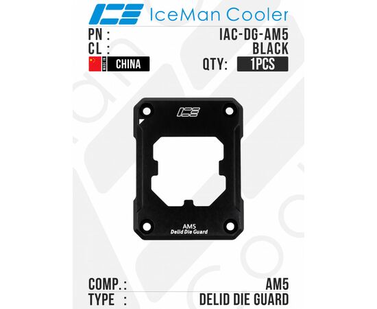 Защитная рамка IceManCooler Delid Die Guard предназначена для установки процессорного кулера или водоблока напрямую на кристалл (die) процессоров AMD с сокетом AM5 после снятия штатной теплораспределительной крышки (IHS).