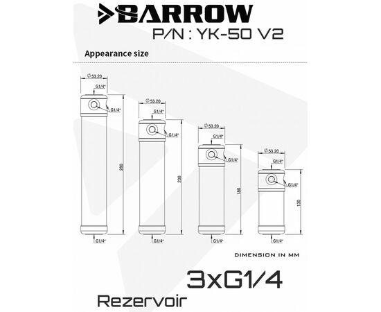 Резервуар Barrow серии YK-50 V2 — элегантное и функциональное решение для систем водяного охлаждения в стиле минимализма. Выполненный в классической трубчатой форме, он сочетает в себе лаконичный дизайн и продуманную конструкцию: внутренний диаметр трубки — 50 мм, а общий внешний диаметр корпуса — всего 53,2 мм, что делает резервуар компактным, но вместительным. В комплекте предусмотрены два Г-образных крепления и два надёжных классических хомута — это позволяет гибко разместить резервуар практически в любом корпусе. Простота установки, безупречное качество сборки и универсальность монтажа делают YK-50 V2 идеальным выбором как для новичков, так и для опытных энтузиастов кастомных систем охлаждения.