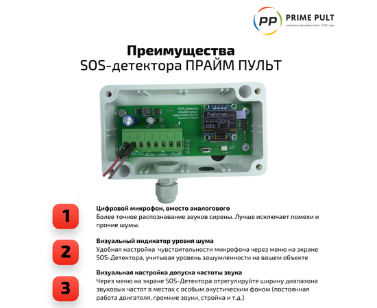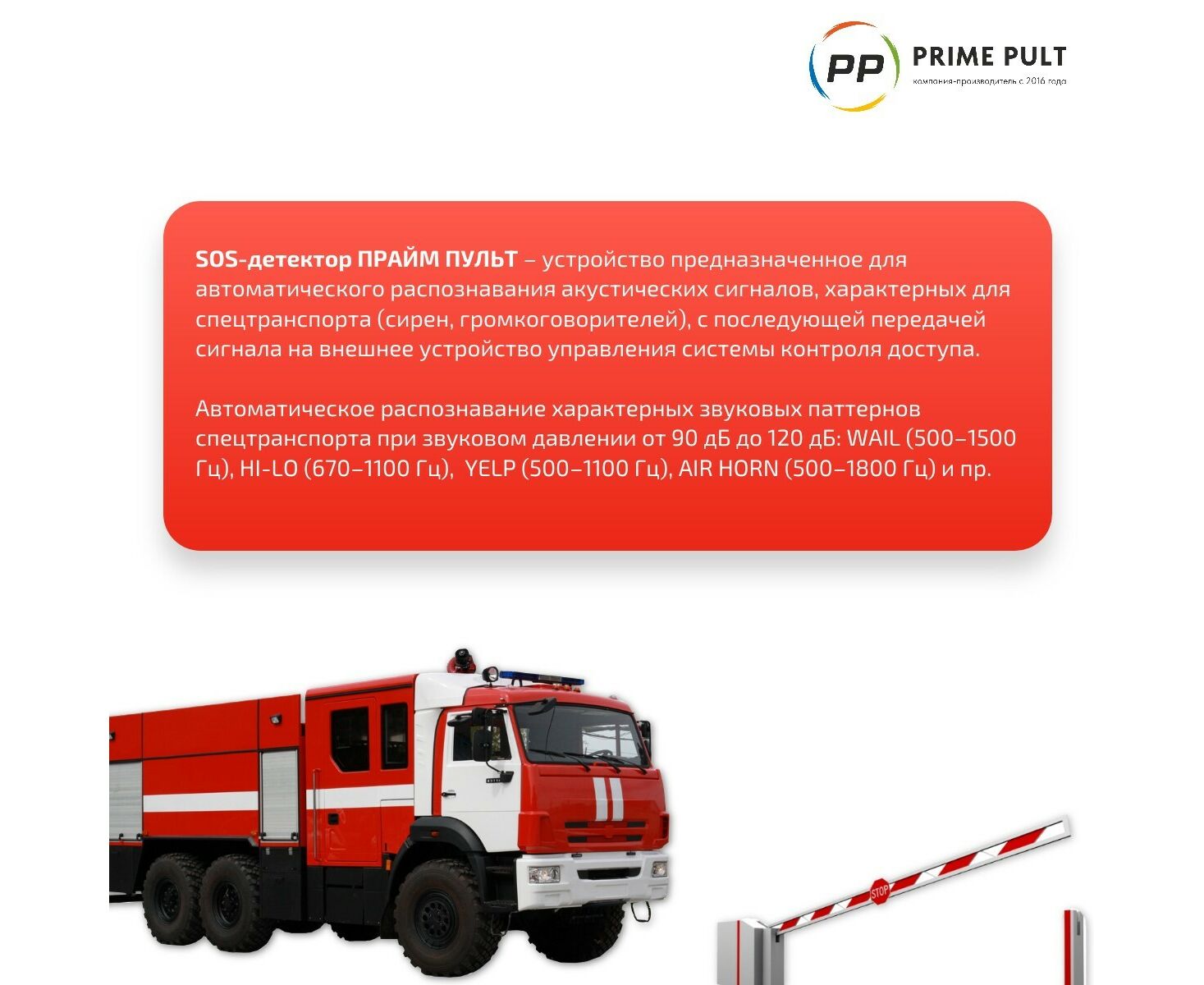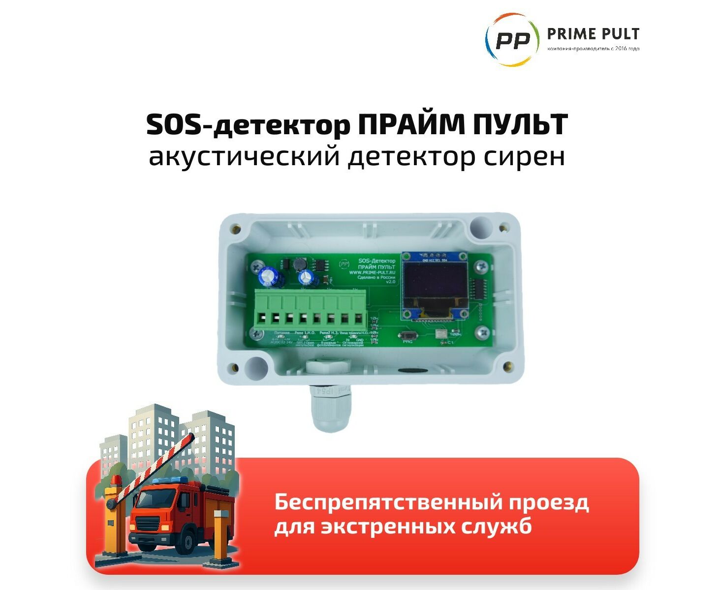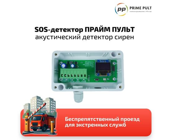 SOS-Детектор ПРАЙМ ПУЛЬТ – комплексное решение для беспрепятственного доступа экстренных служб. Устройство предназначено для автоматического распознавания акустических сигналов, характерных для спецтранспорта (сирен, громкоговорителей), с последующей передачей сигнала на внешнее устройство управления системы контроля доступа.