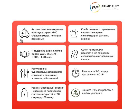 - Автоматическое открытие при звуке сирен: МЧС, скорая помощь, полиция,