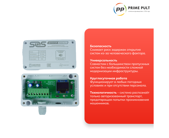 Акустический SOS-детектор предназначен для автоматического реагирования на сигналы спецтранспорта. Устройство интегрируется в системы контроля доступа и используется: