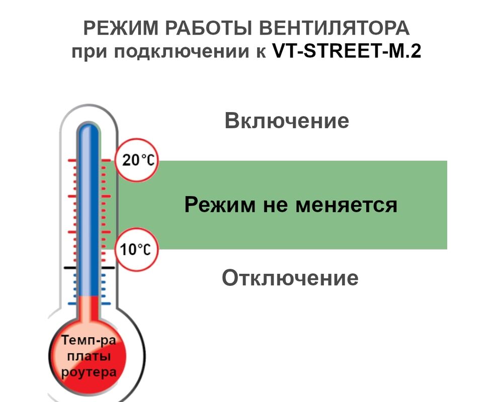 Конструкция и элементная база роутера VT-STREET-M.2 позволяет использовать его при диапазоне температур от -30 до +70 °C без дополнительного подогрева. Для отведения тепла от модема используются отверстия на задней стороне платы.