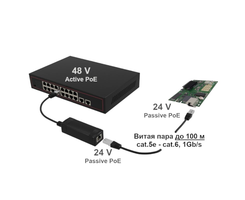 Технология подачи питания и данных по одному кабелю Passive PoE 24 V.